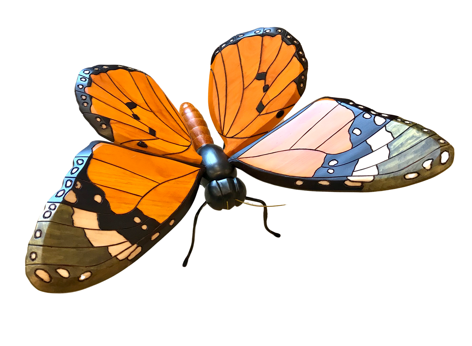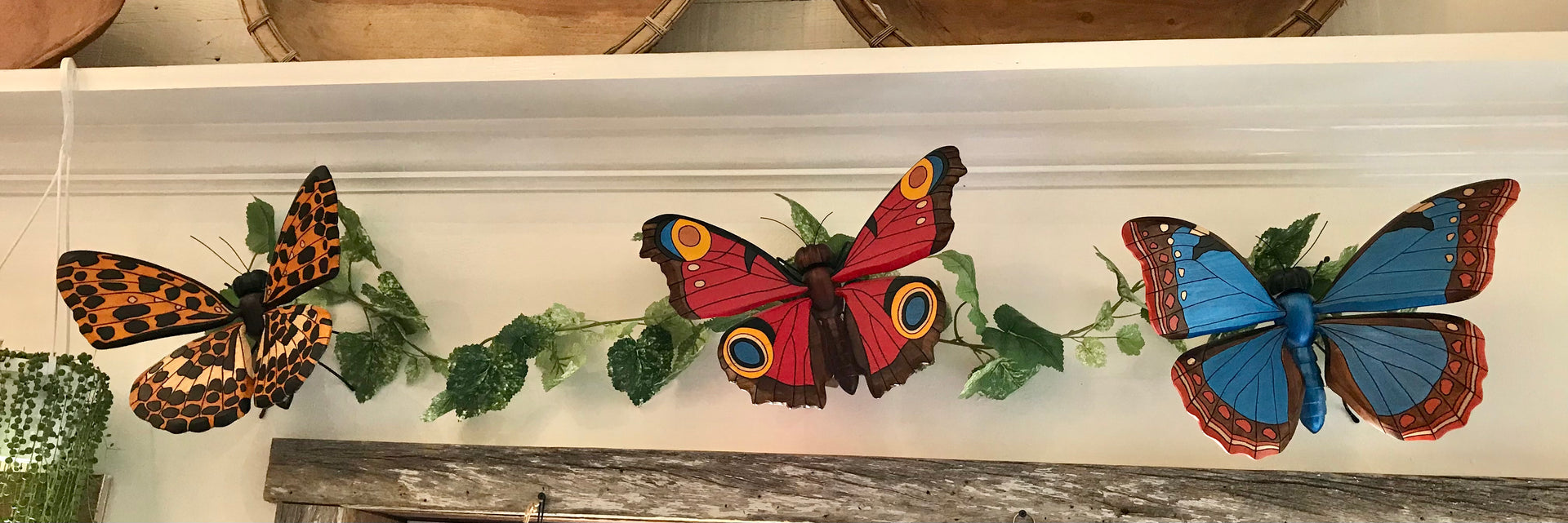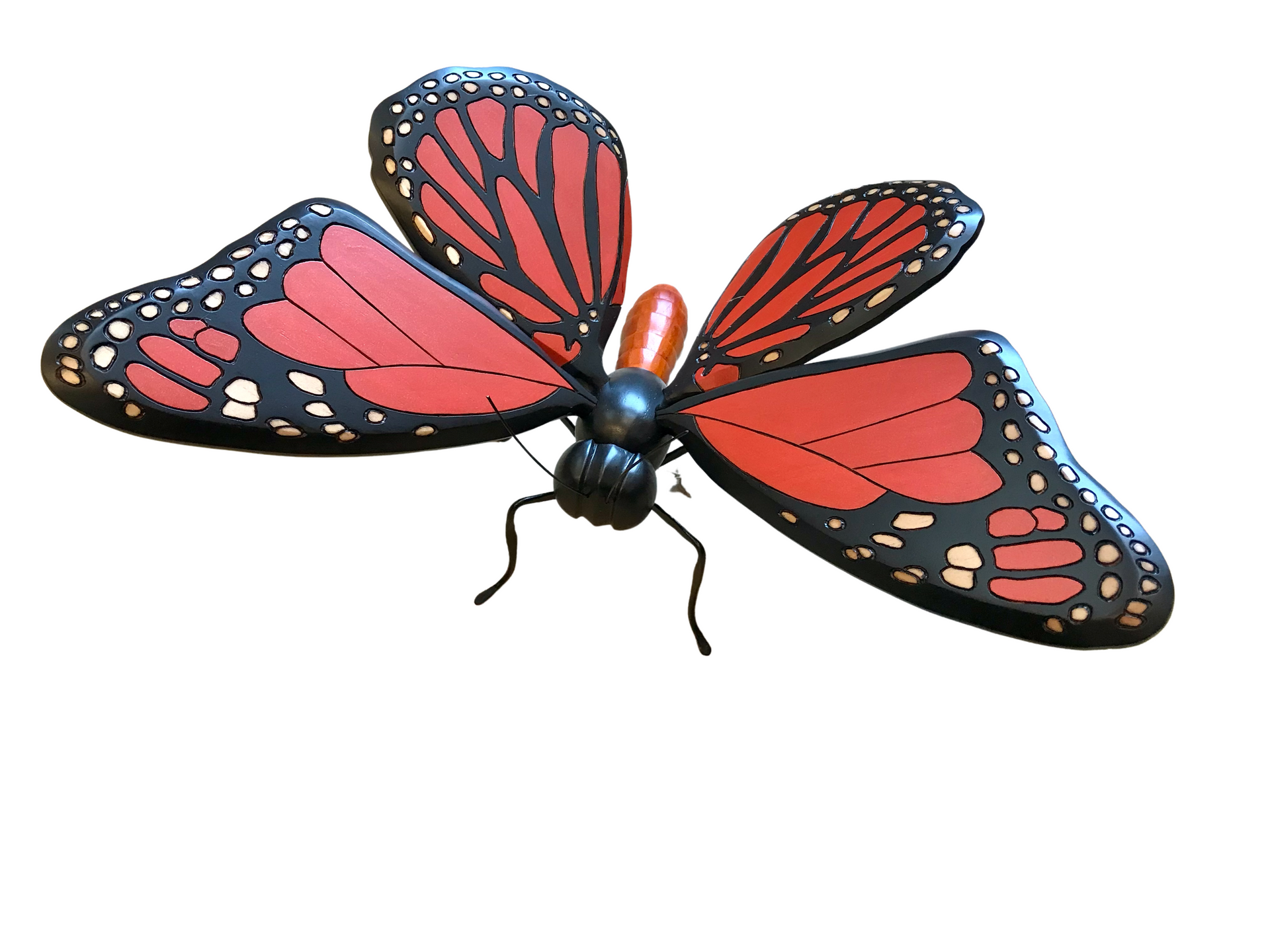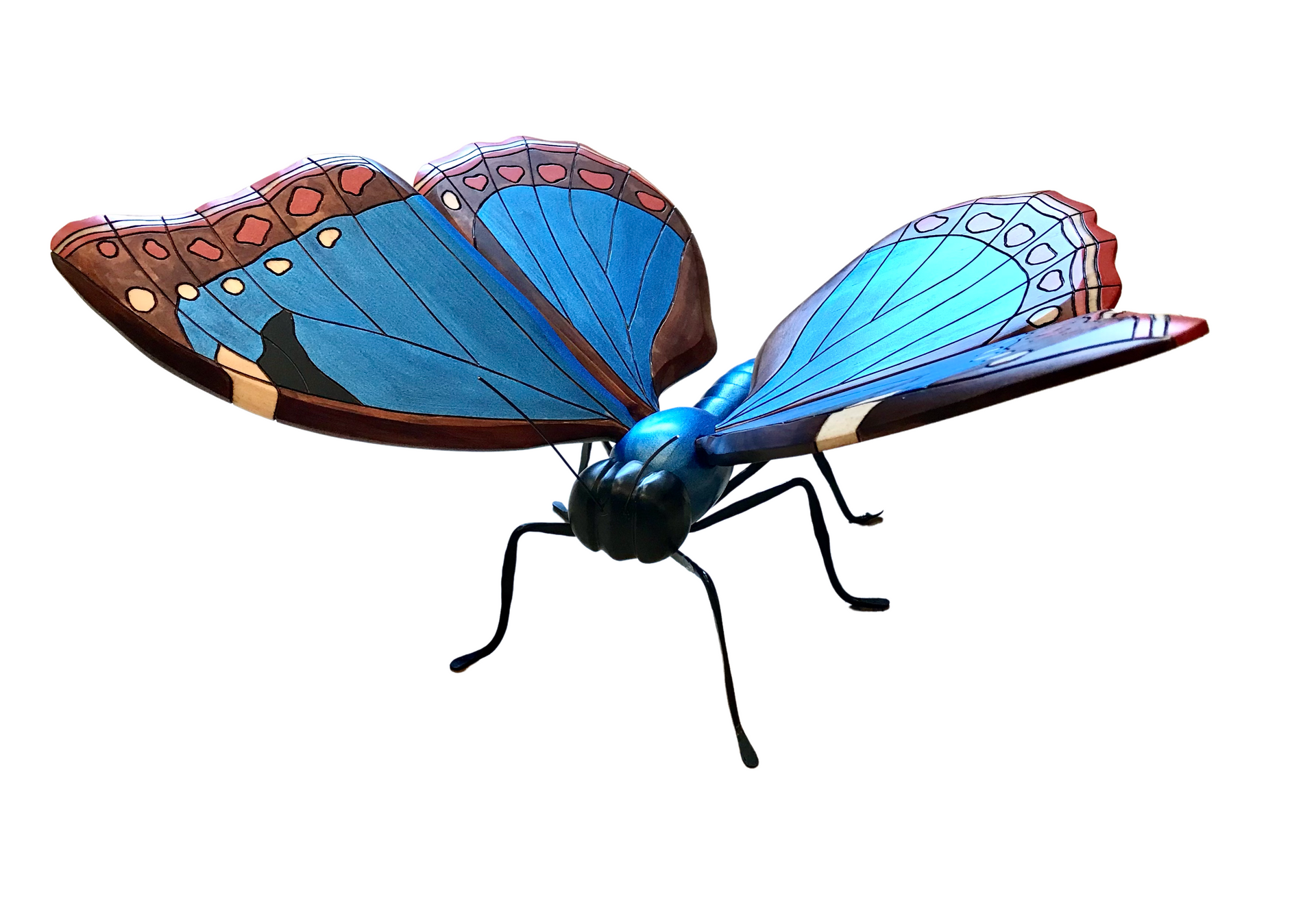 These butterflies were hand carved and painted by Colombian artisans. The wings are adjustable and so they can be positioned to give the best look wherever displayed. Around the world people view the butterfly as a symbol of bringing lightness, joy and bliss to those who surround them, so bring one into your space and enjoy.