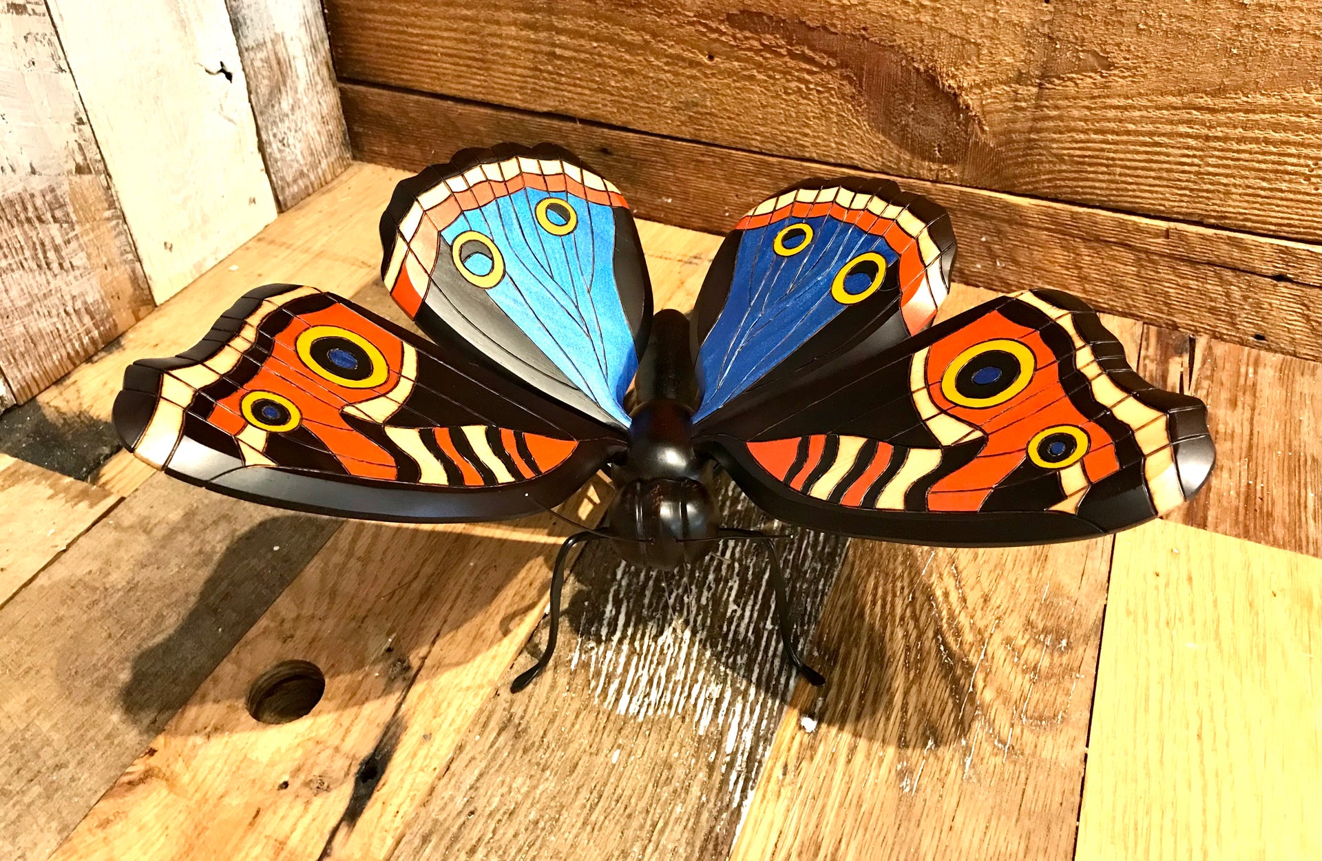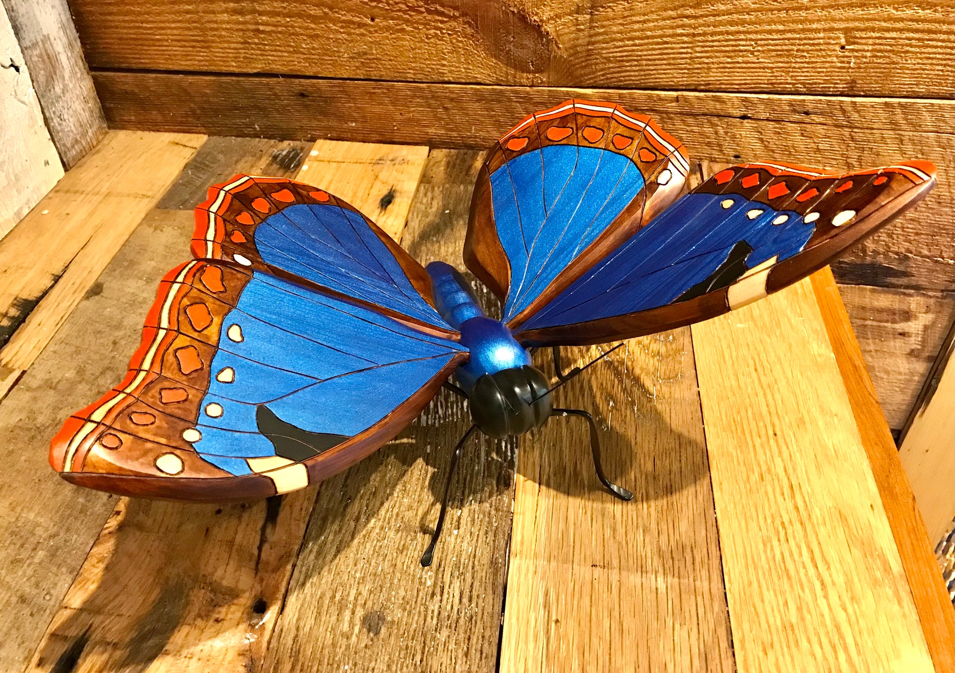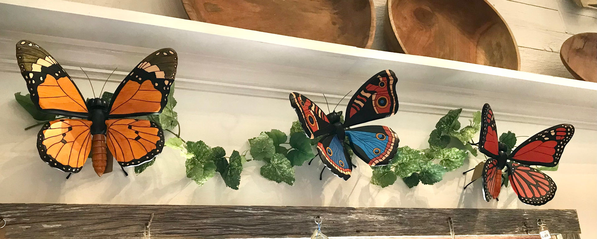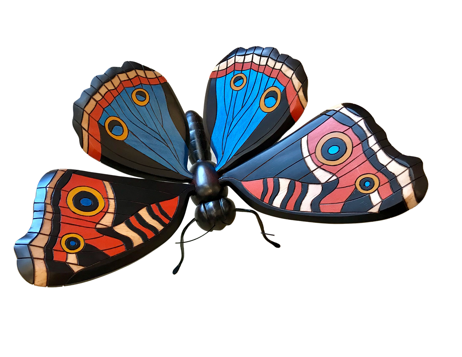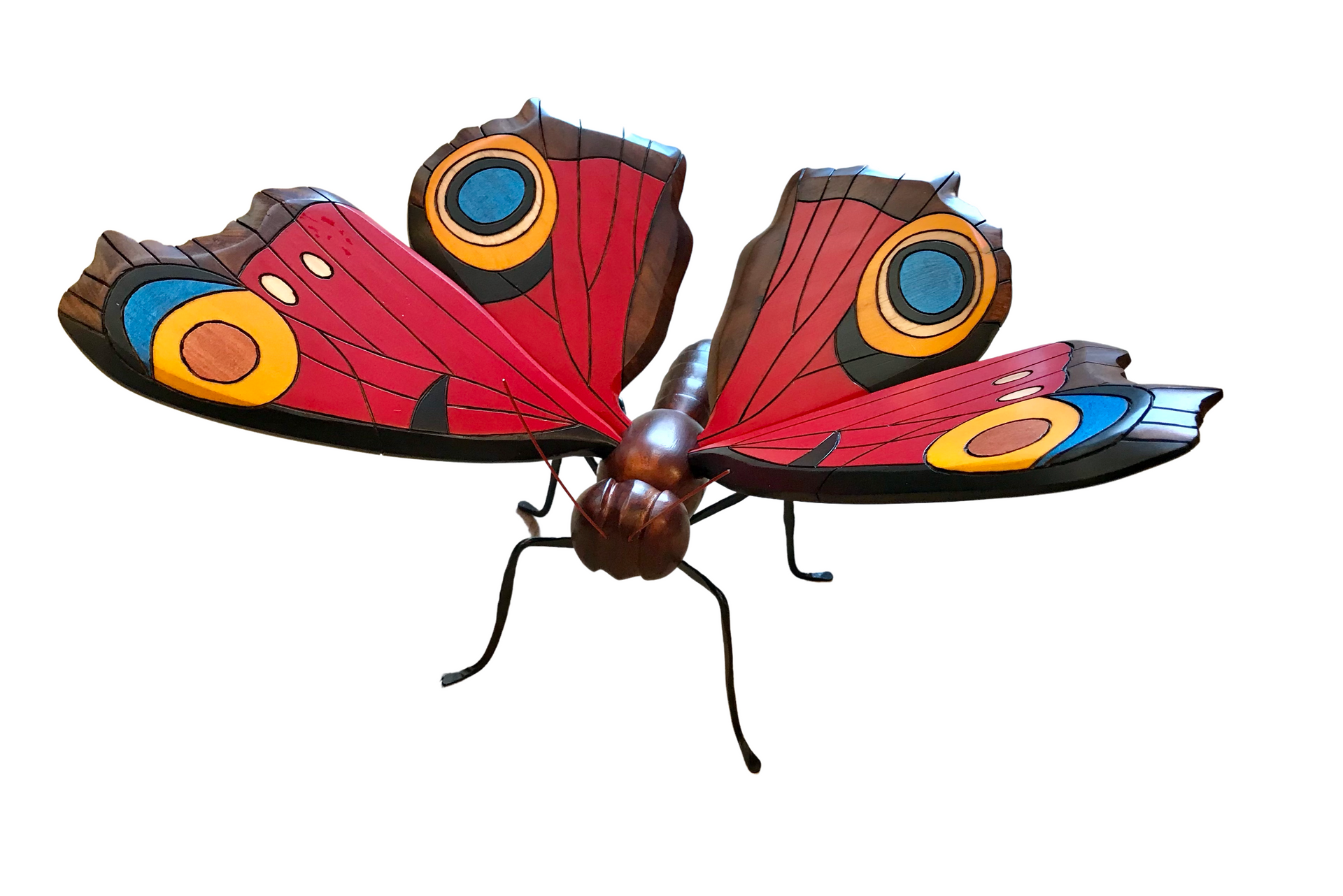 These butterflies were hand carved and painted by Colombian artisans. The wings are adjustable and so they can be positioned to give the best look wherever displayed. Around the world people view the butterfly as a symbol of bringing lightness, joy and bliss to those who surround them, so bring one into your space and enjoy.