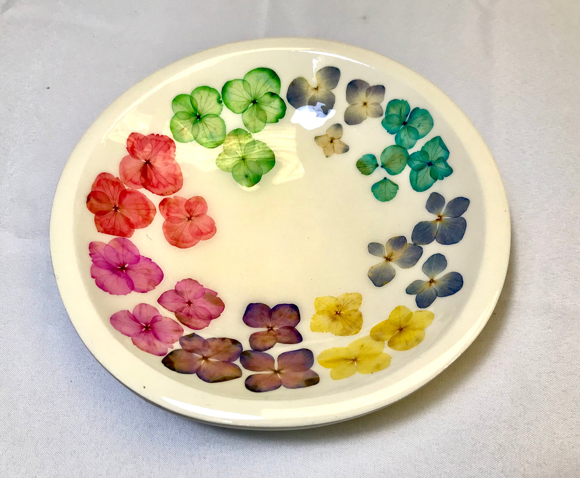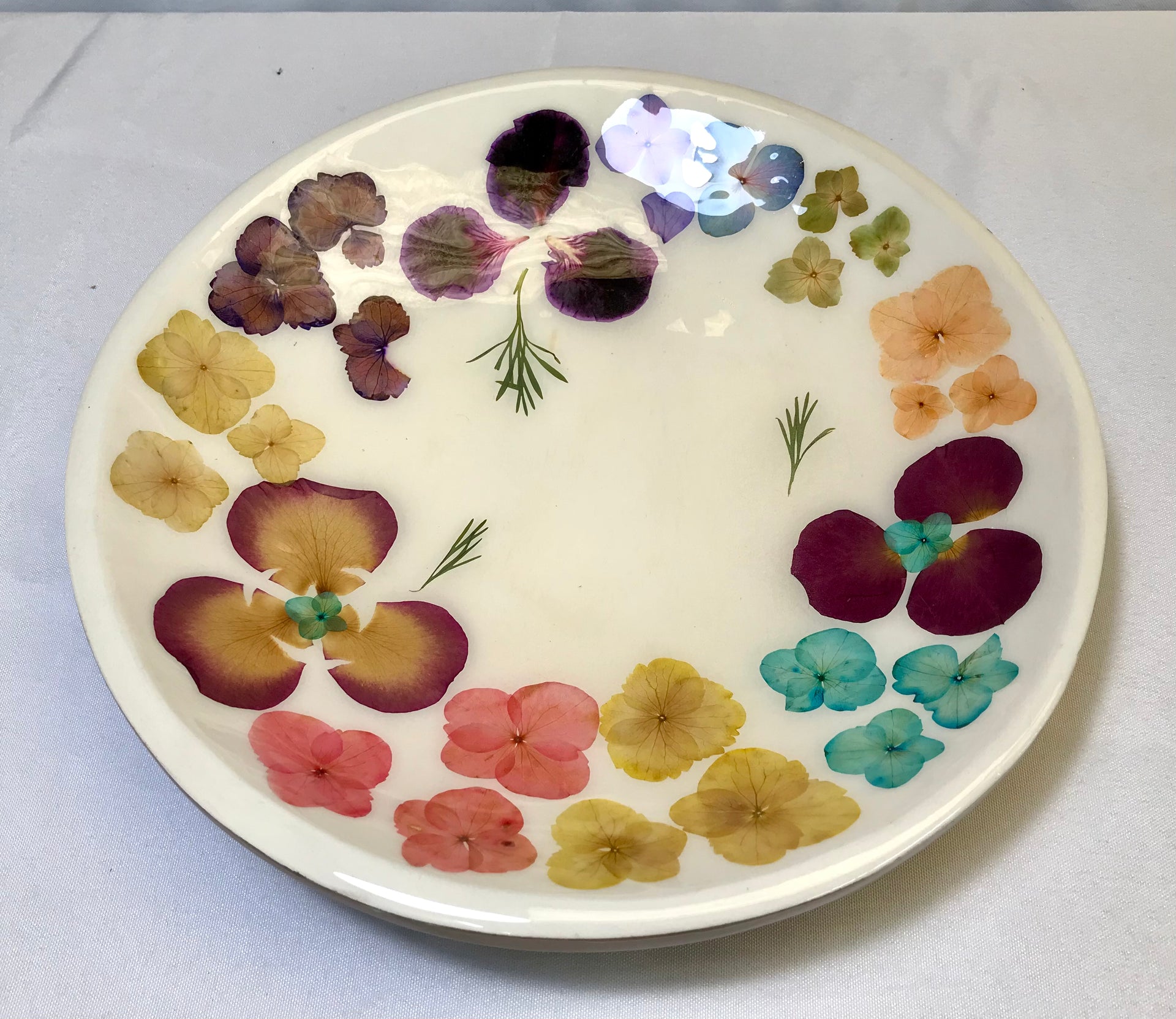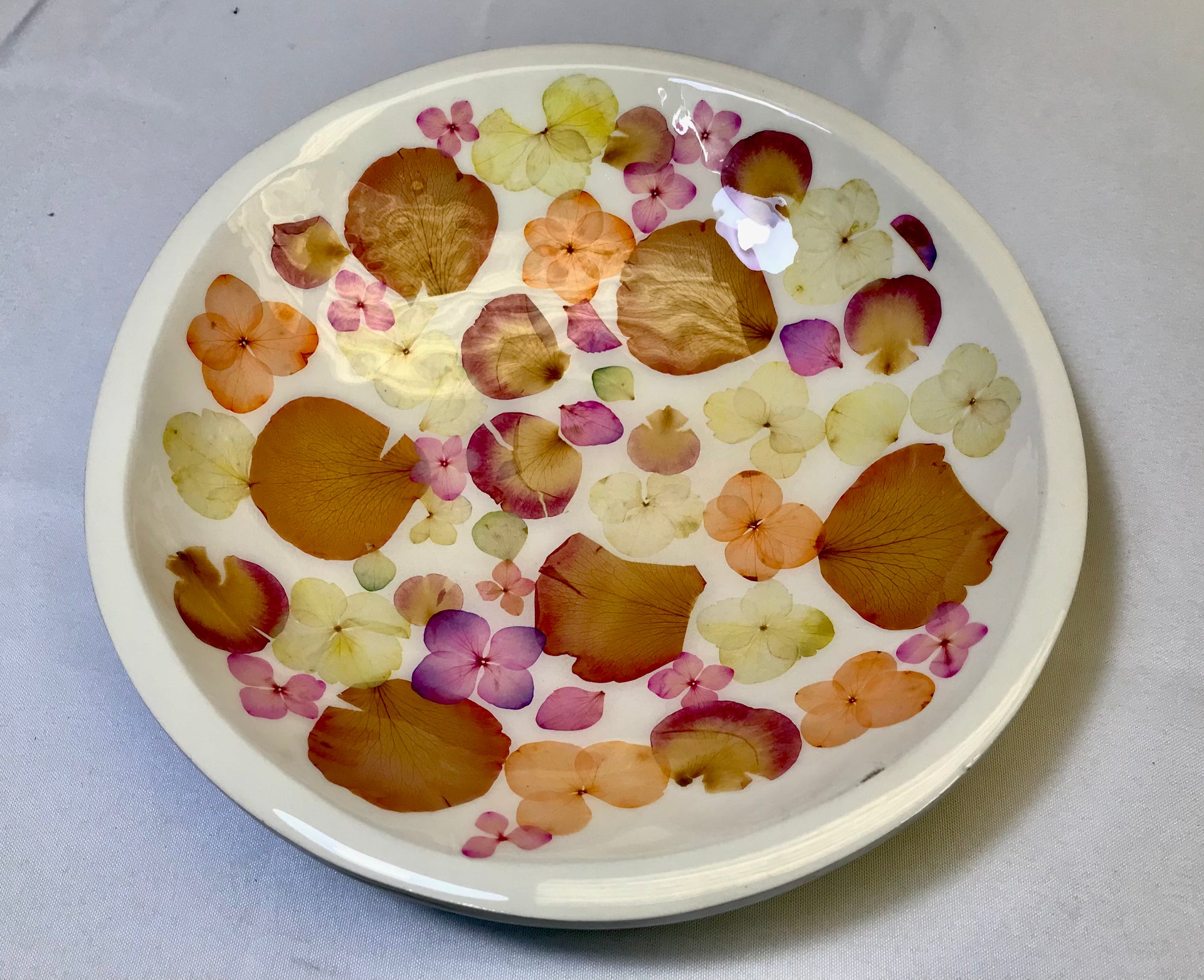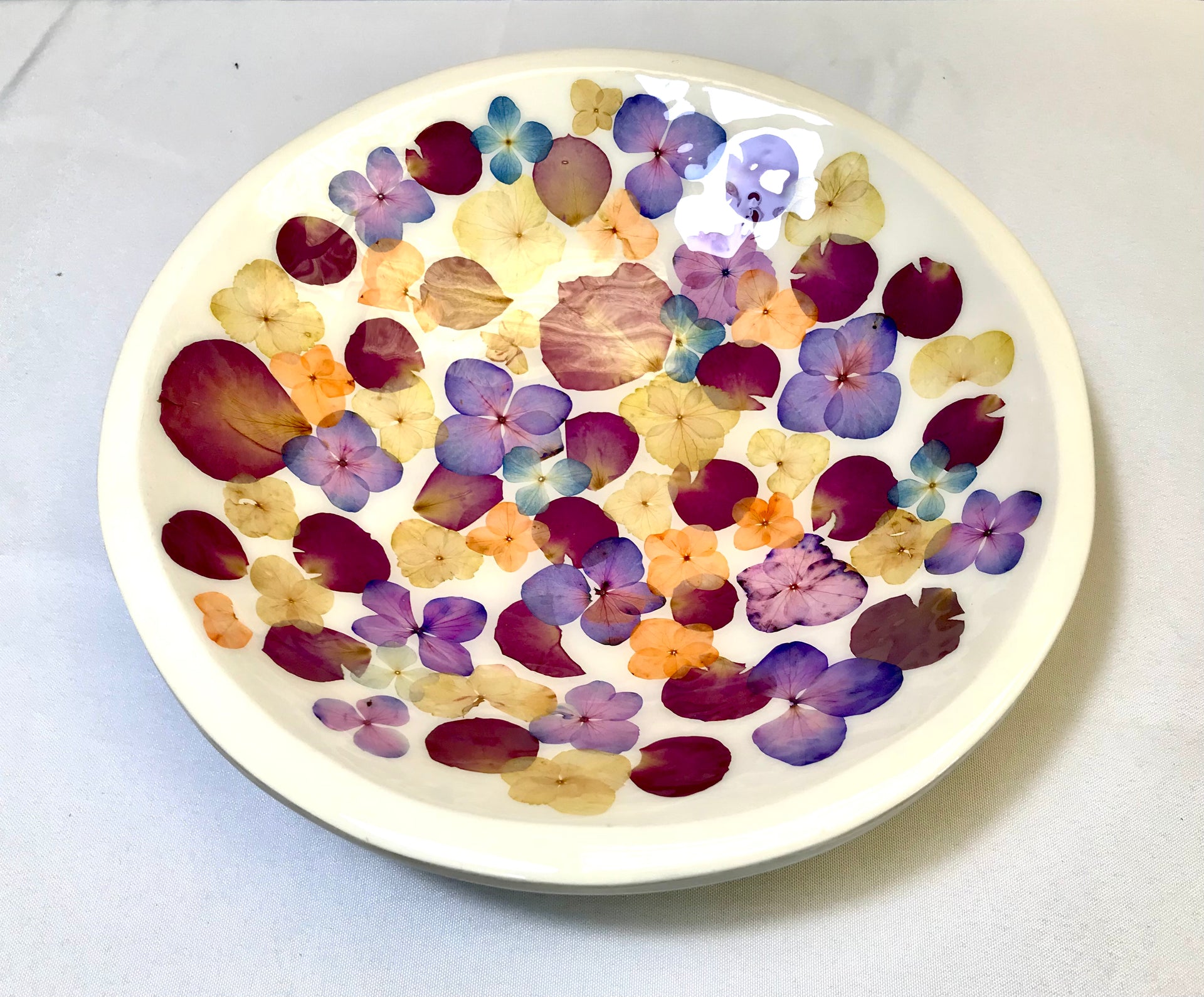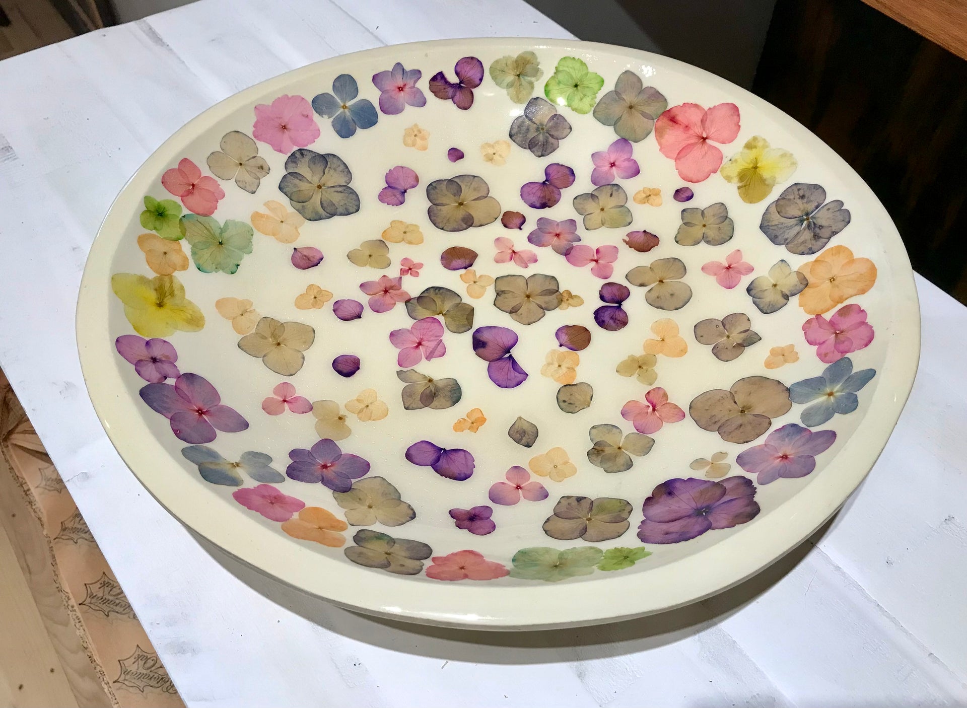 Our Pressed Flowers line is handmade with love by a woman artisan in Bogota, Colombia. She grows the flowers in her home garden, picks them once they bloom, and dries them in old fashioned yellow phone books until they are ready to be artfully placed, one by one, onto each individual bowl/platter. Once she lays out her design, she carefully coats the pieces in several layers of epoxy. The process is a long and arduous one, but the result is truly stunning! Each piece is one of a kind.
