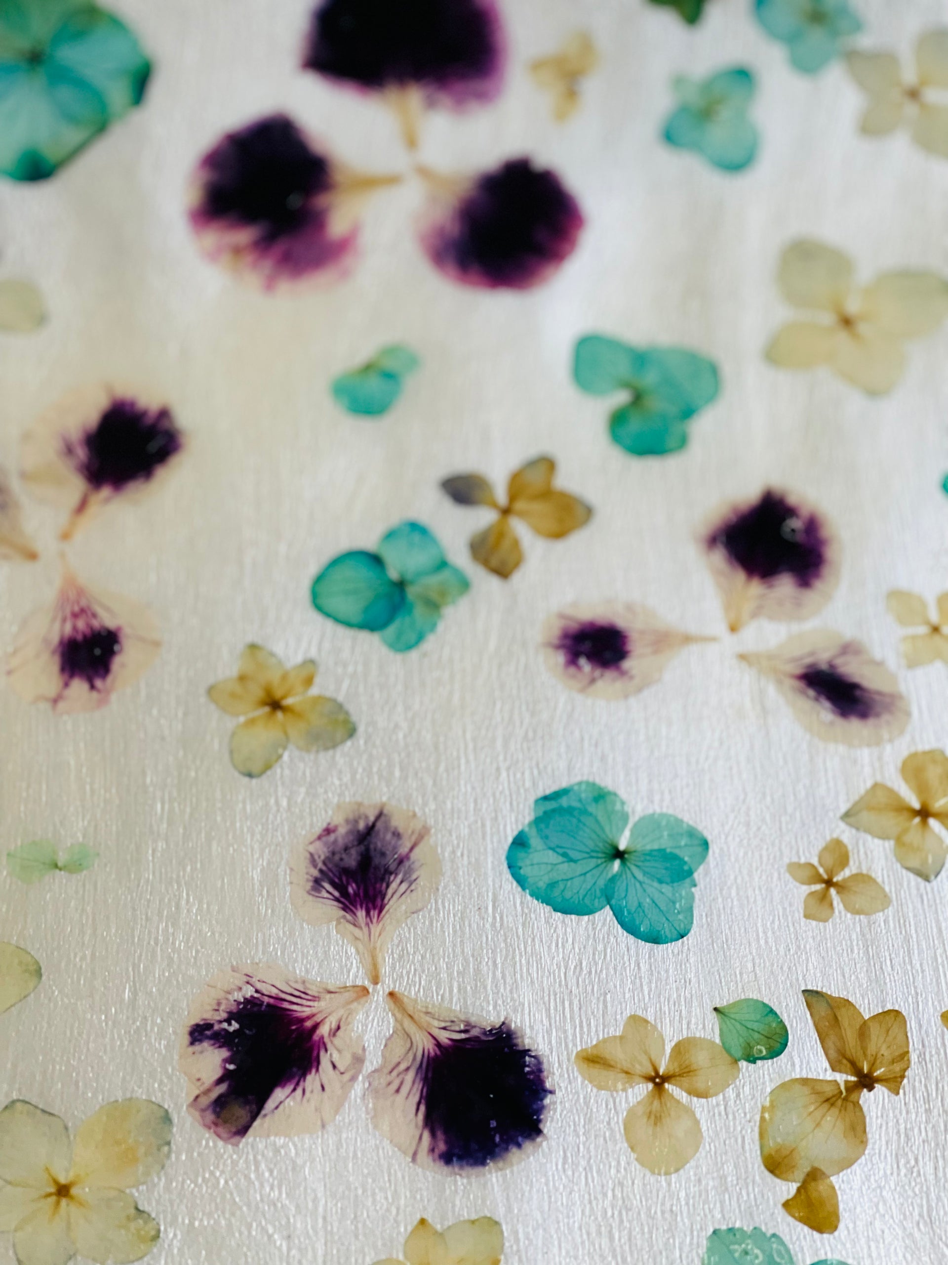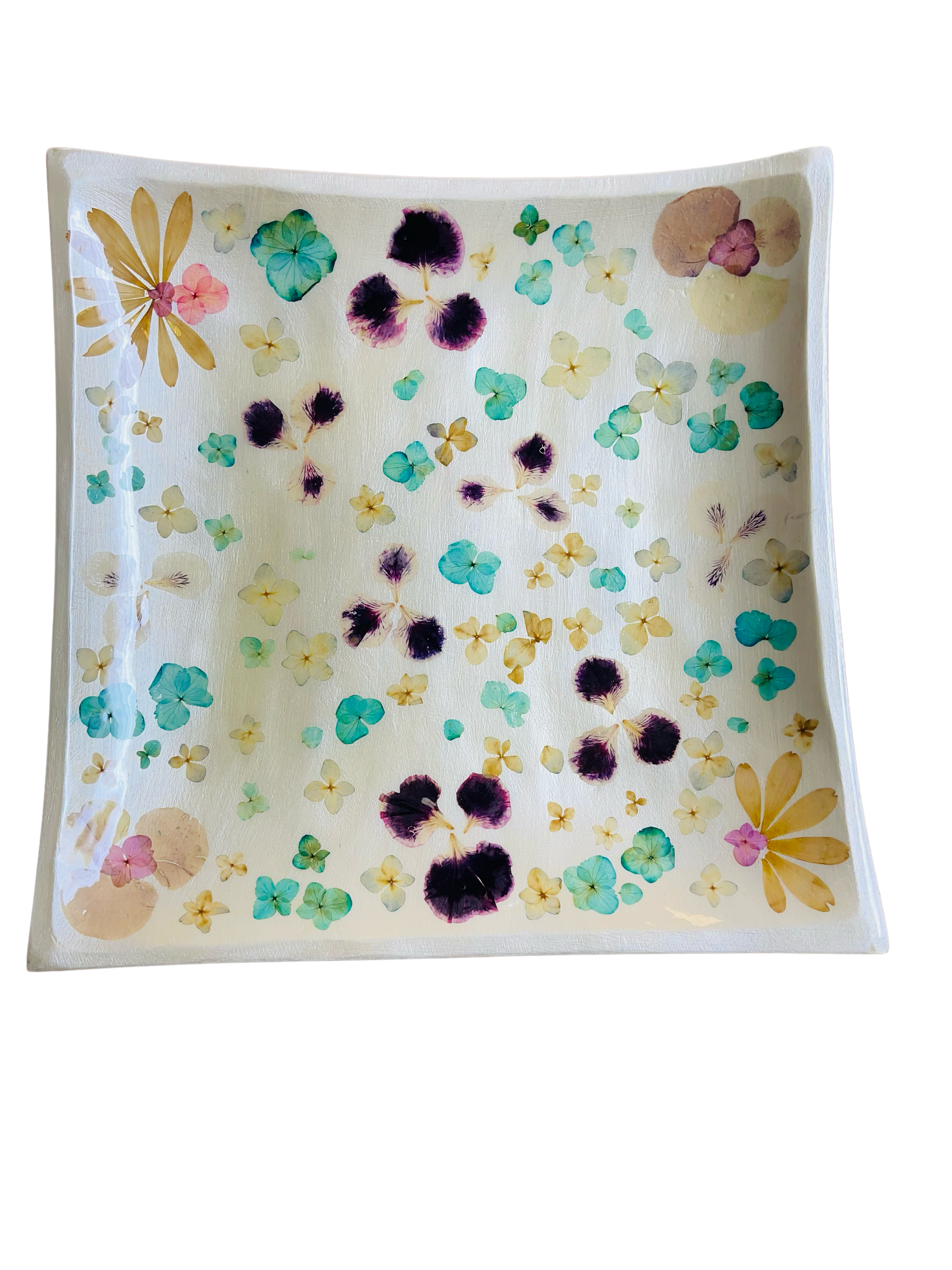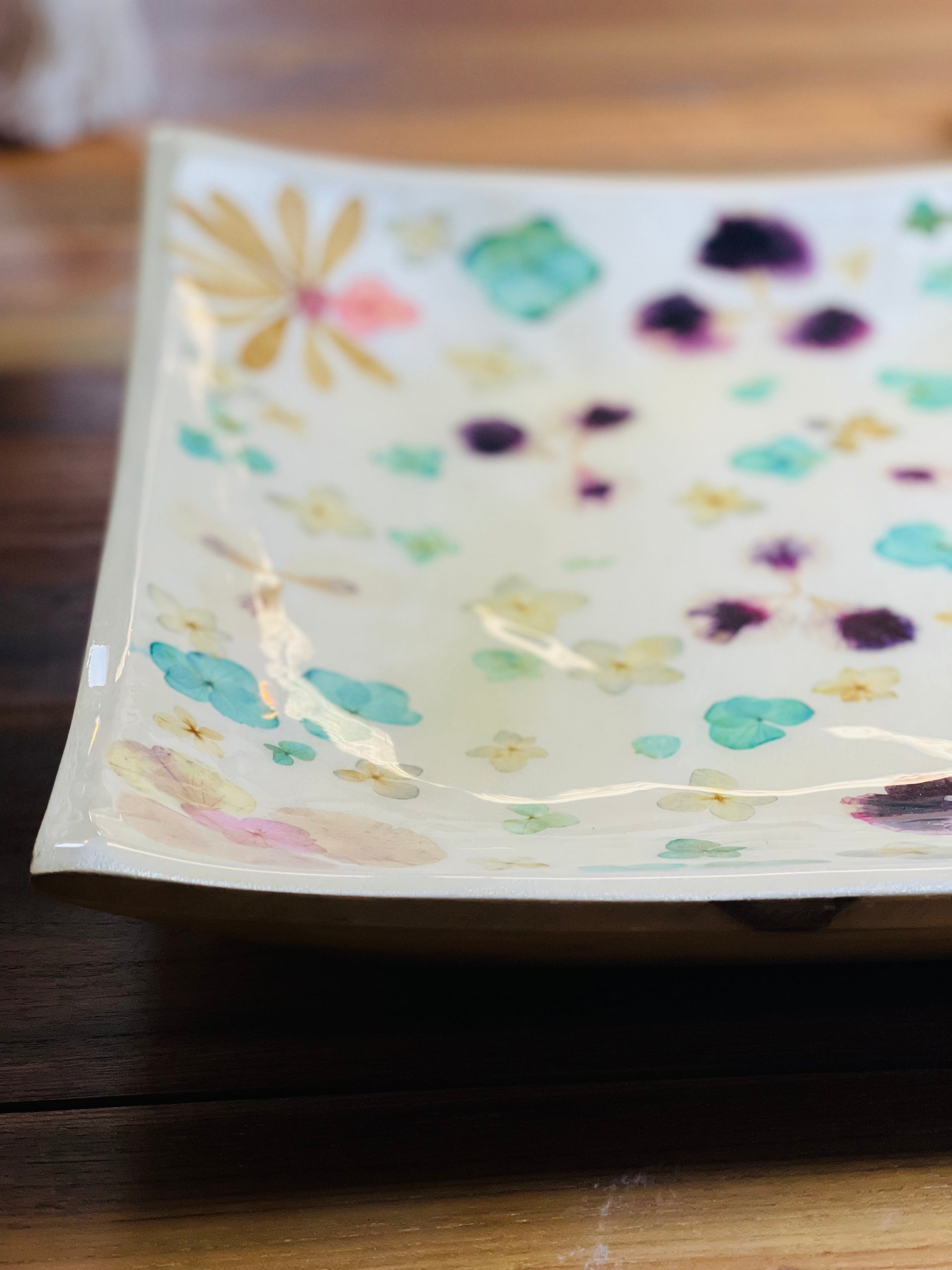 Our Pressed Flowers line is handmade with love by a woman artisan in Bogota, Colombia. She grows the flowers in her home garden, picks them once they bloom, and dries them in old fashioned yellow phone books until they are ready to be artfully placed, one by one, onto each individual bowl/platter. Once she lays out her design, she carefully coats the pieces in several layers of epoxy. The process is a long and arduous one, but the result is truly stunning! Each piece is one of a kind.