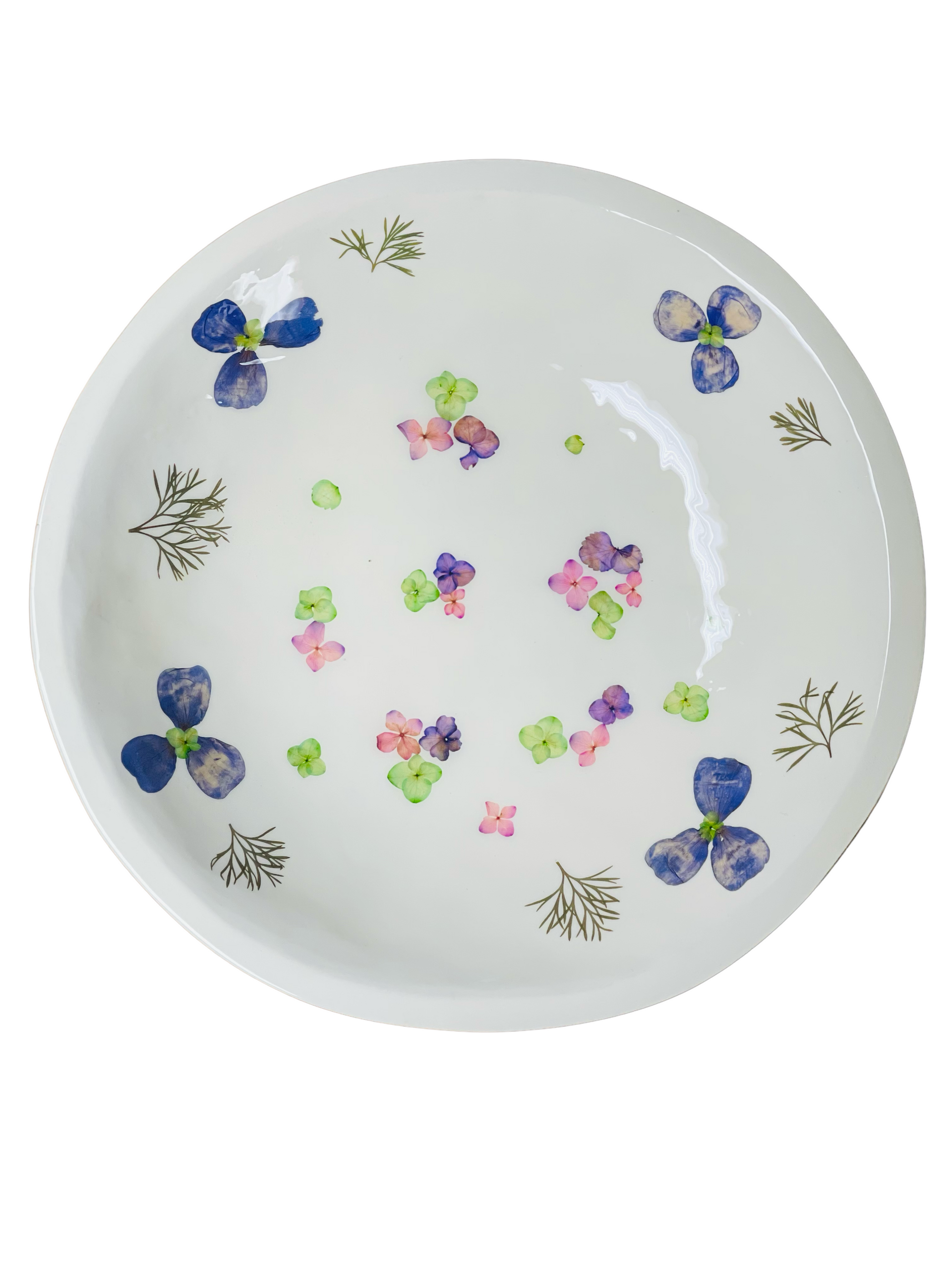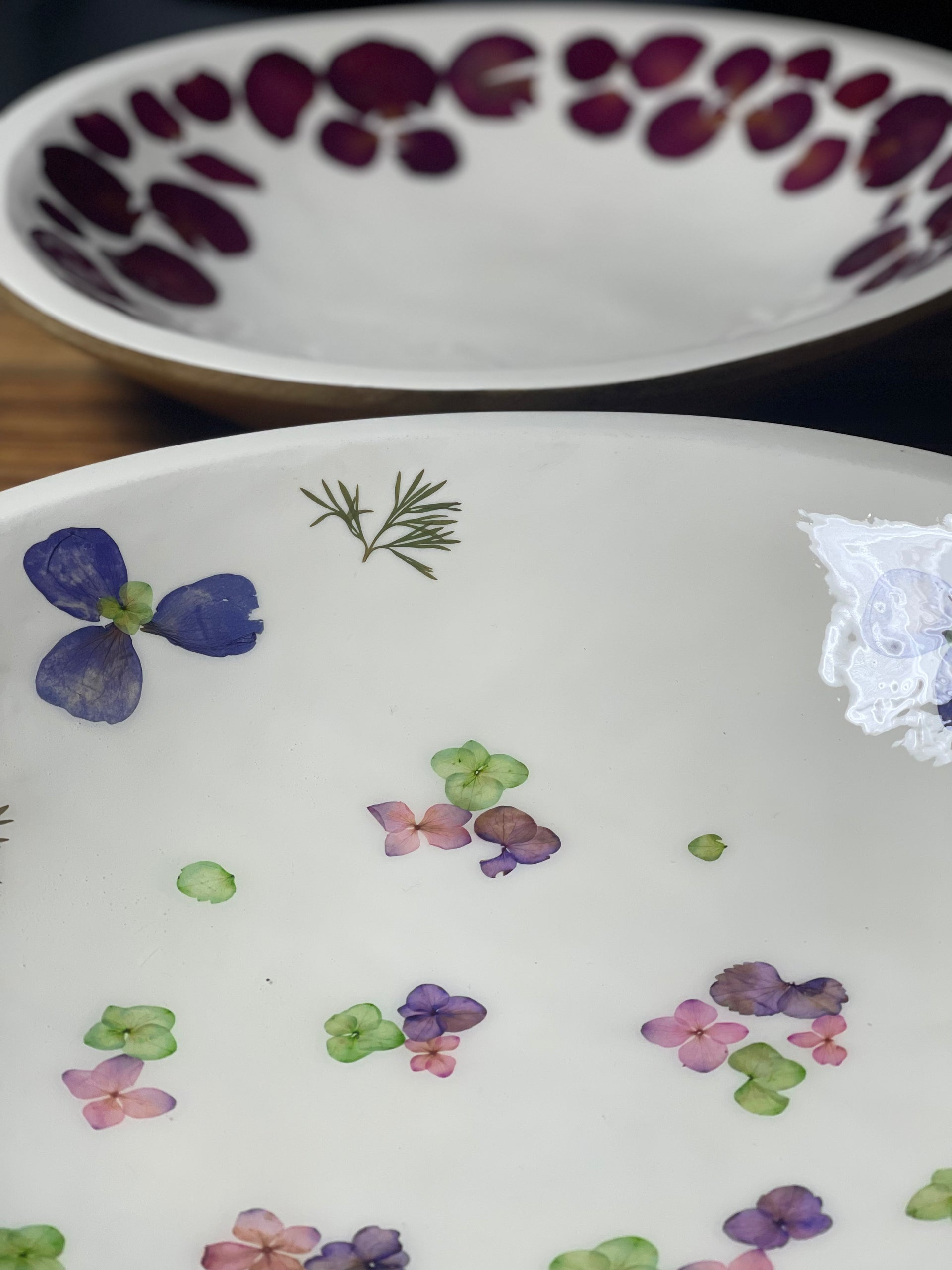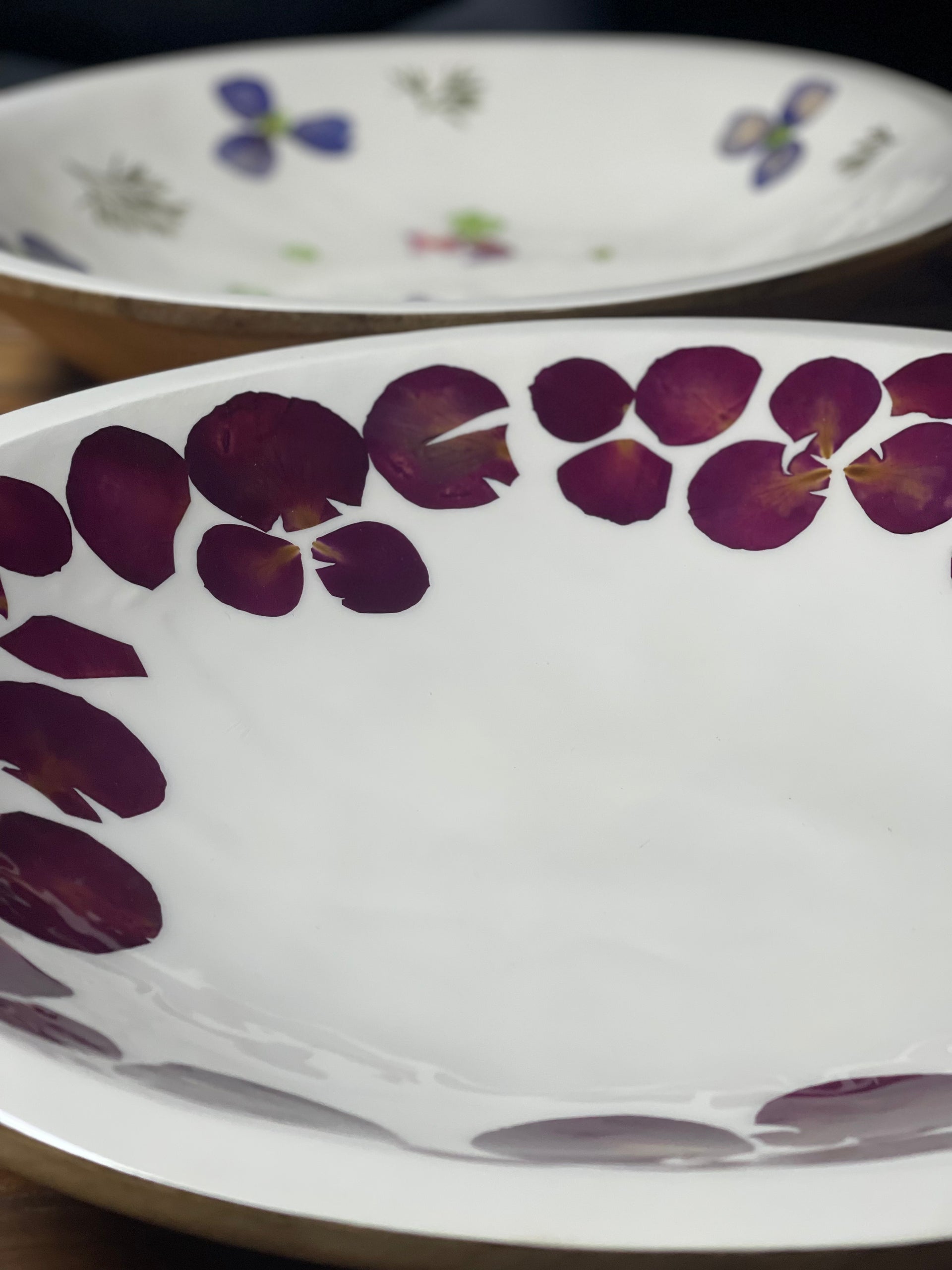 Our Pressed Flowers line is handmade with love by a woman artisan in Bogota, Colombia. She grows the flowers in her home garden, picks them once they bloom, and dries them in old fashioned yellow phone books until they are ready to be artfully placed, one by one, onto each individual bowl/platter. Once she lays out her design, she carefully coats the pieces in several layers of epoxy. The process is a long and arduous one, but the result is truly stunning! Each piece is one of a kind.