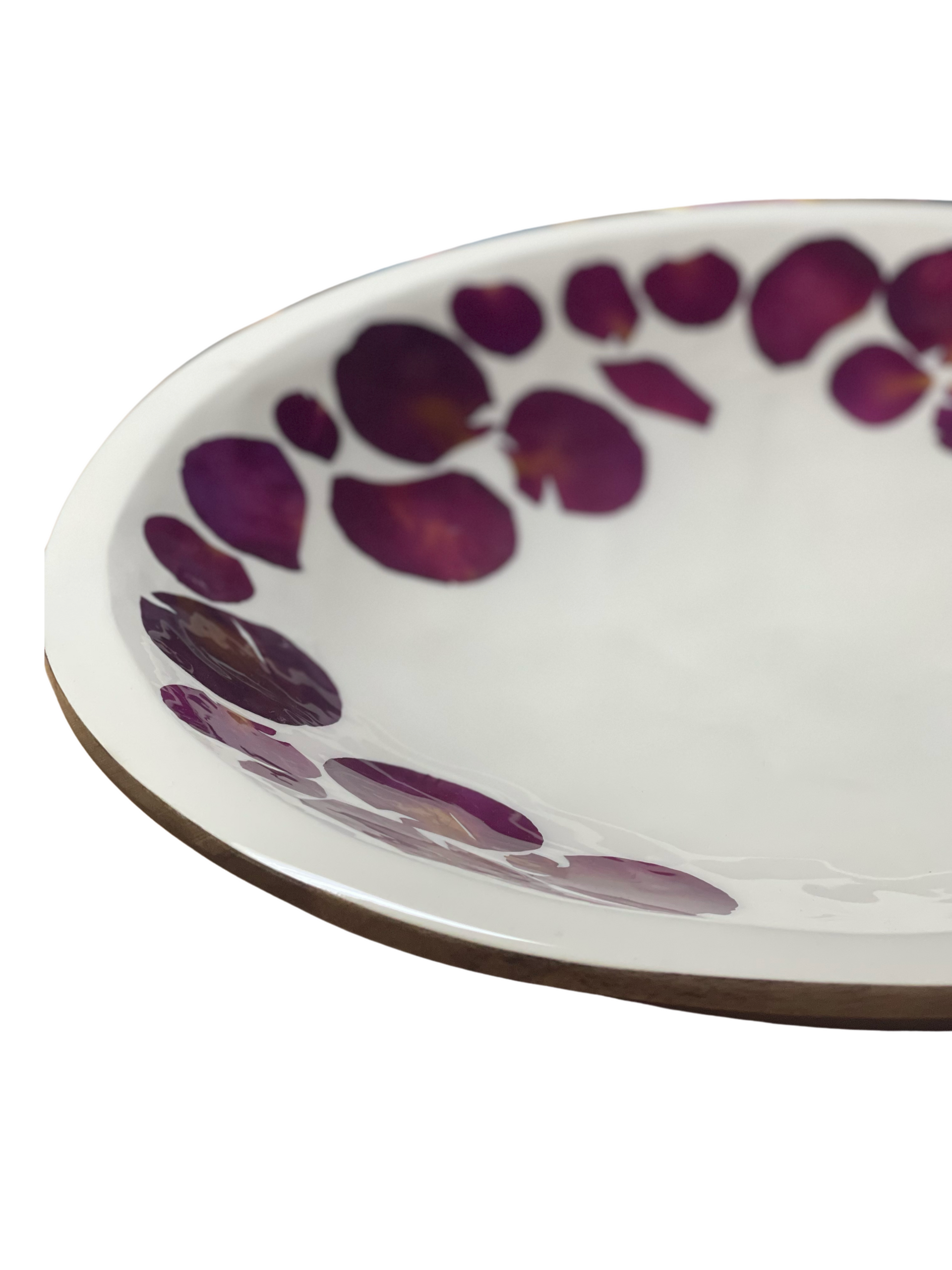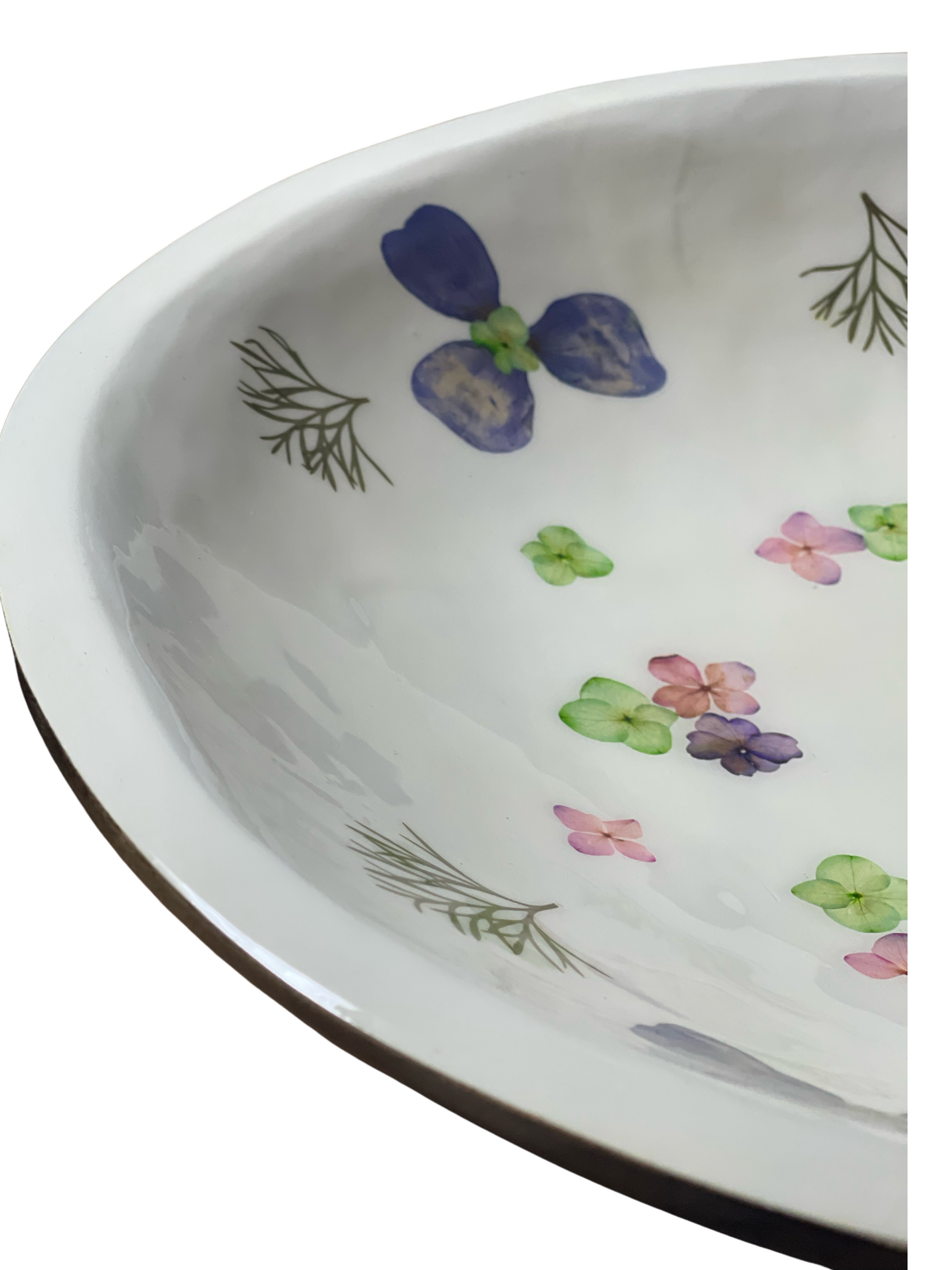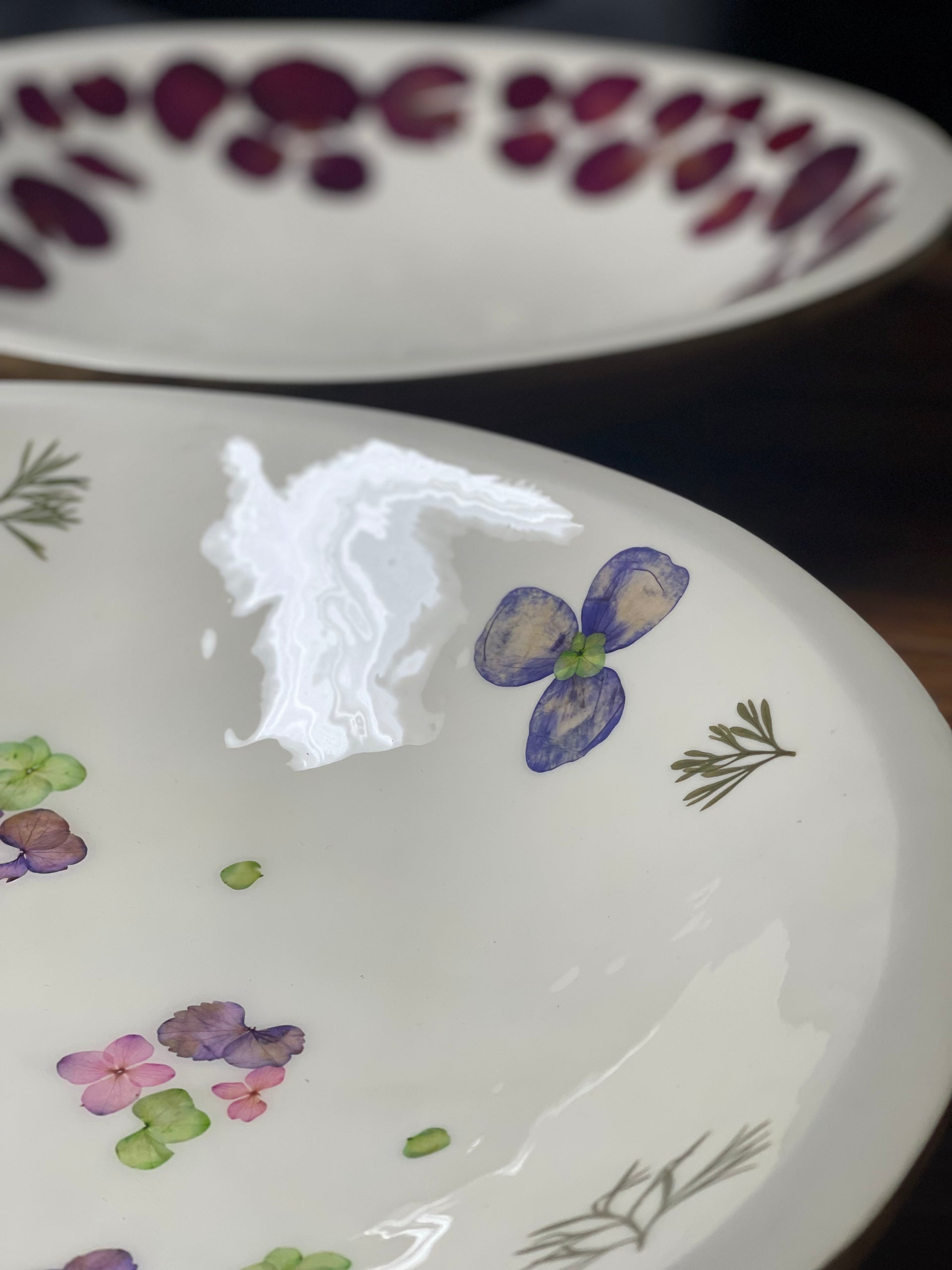 Our Pressed Flowers line is handmade with love by a woman artisan in Bogota, Colombia. She grows the flowers in her home garden, picks them once they bloom, and dries them in old fashioned yellow phone books until they are ready to be artfully placed, one by one, onto each individual bowl/platter. Once she lays out her design, she carefully coats the pieces in several layers of epoxy. The process is a long and arduous one, but the result is truly stunning! Each piece is one of a kind.