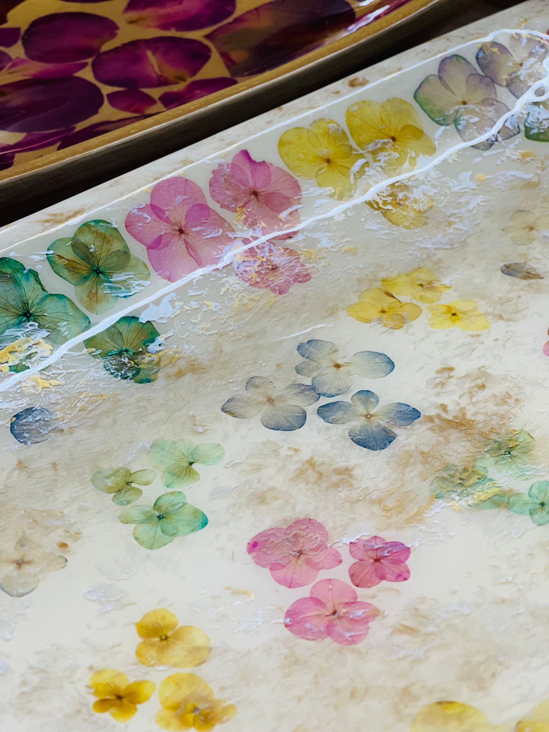 Our Pressed Flowers line is handmade with love by a woman artisan in Bogota, Colombia. She grows the flowers in her home garden, picks them once they bloom, and dries them in old fashioned yellow phone books until they are ready to be artfully placed, one by one, onto each individual bowl/platter. Once she lays out her design, she carefully coats the pieces in several layers of epoxy. The process is a long and arduous one, but the result is truly stunning! Each piece is one of a kind.