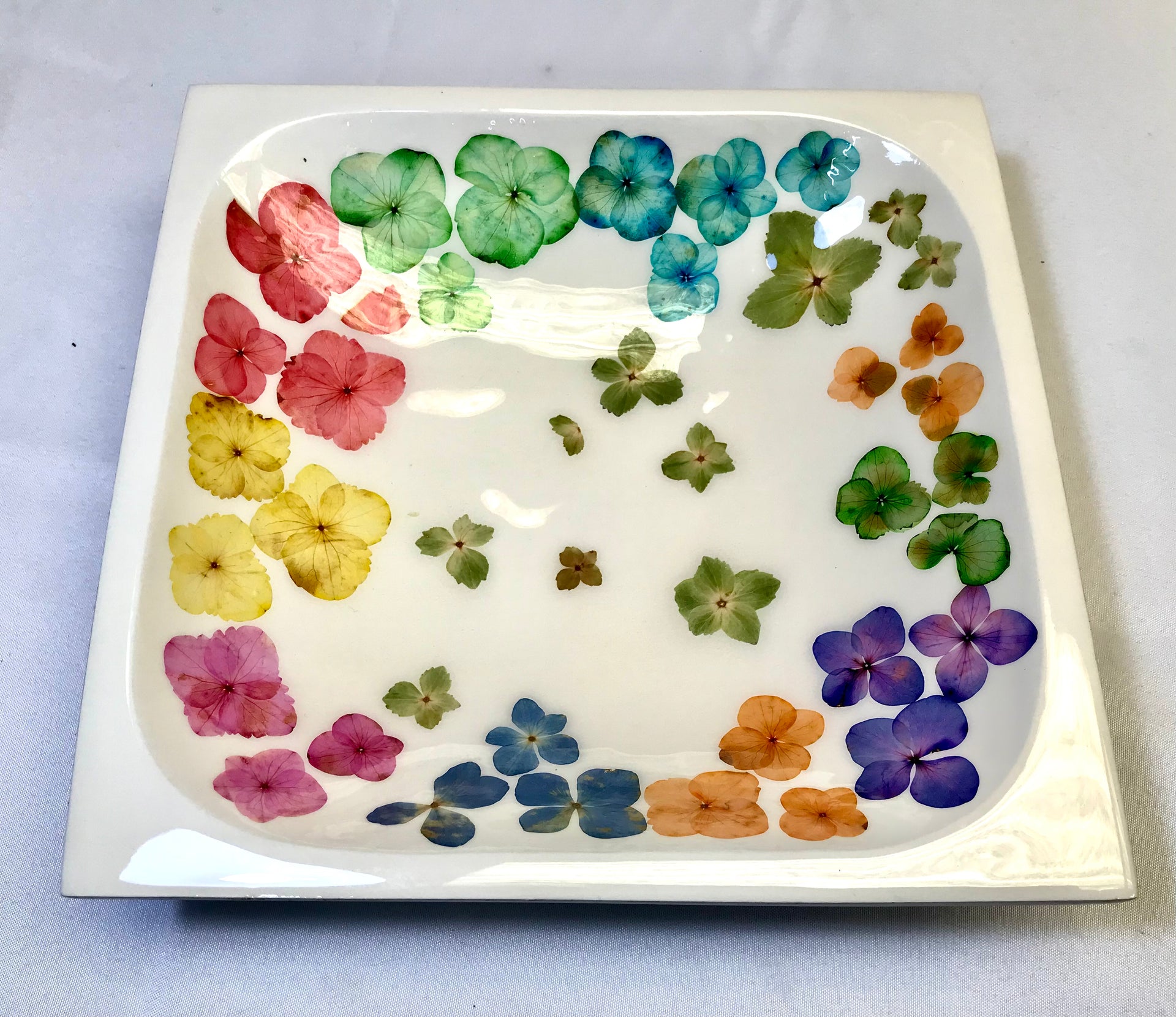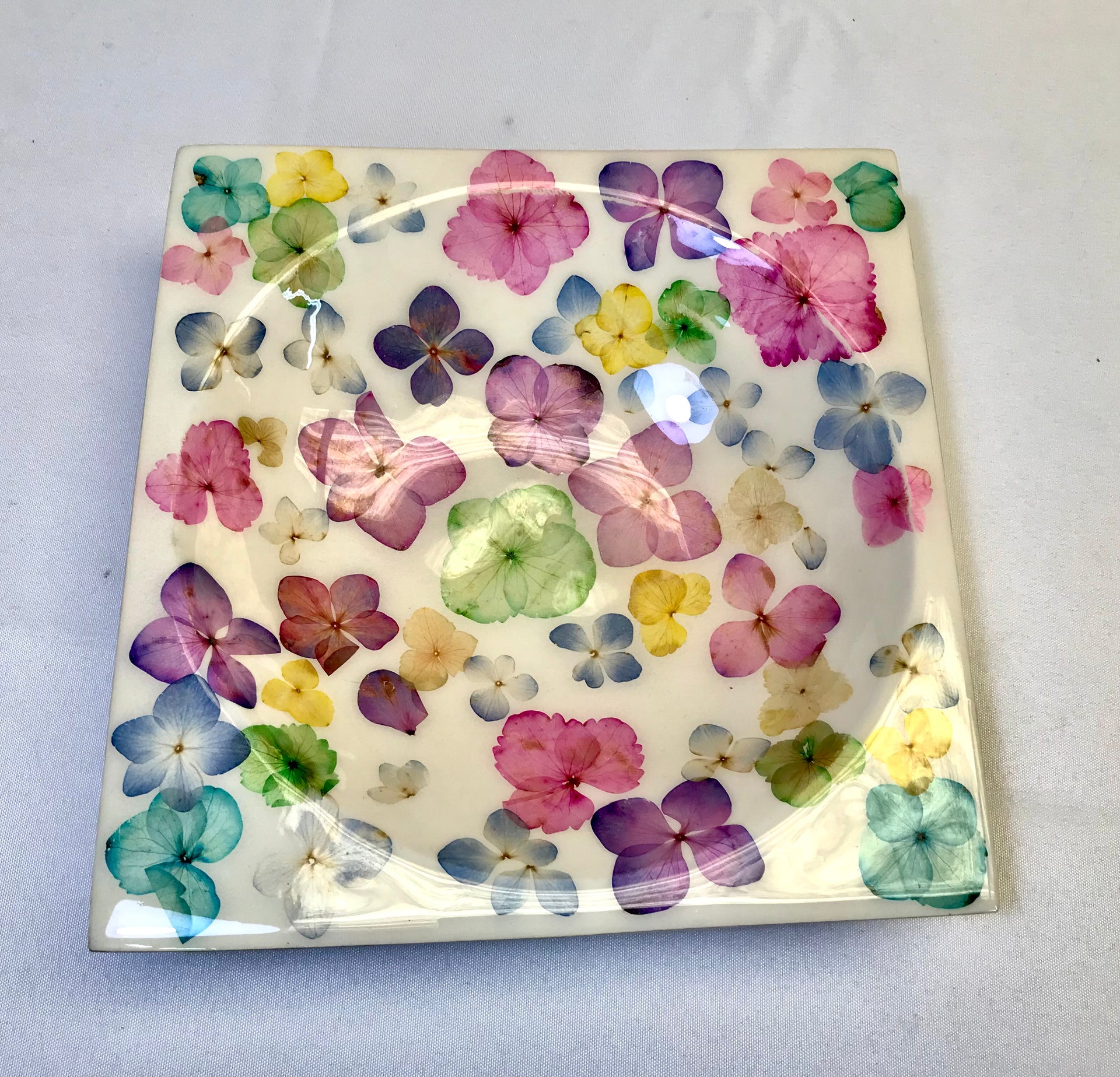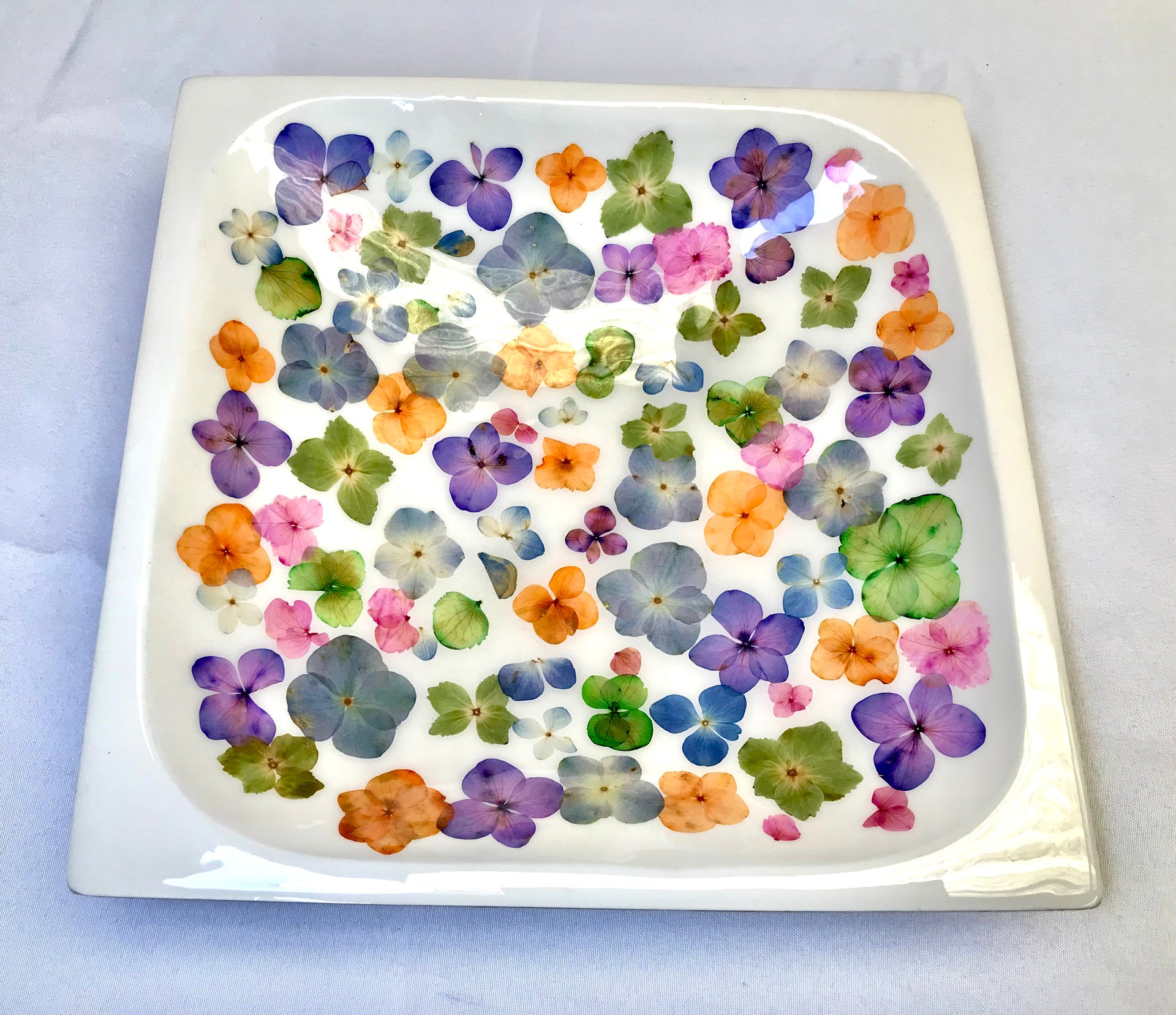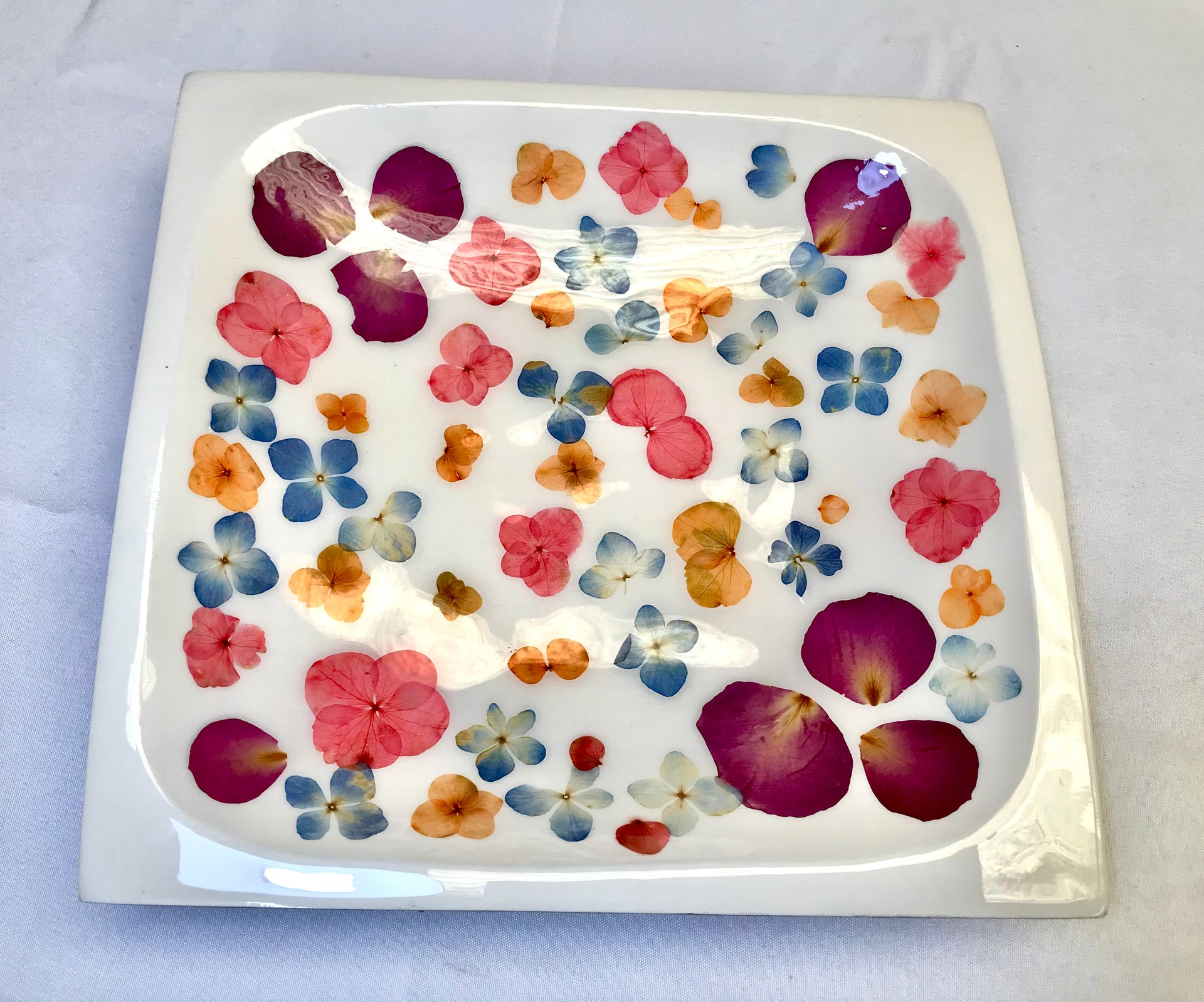 Our Pressed Flowers line is handmade with love by a woman artisan in Bogota, Colombia. She grows the flowers in her home garden, picks them once they bloom, and dries them in old fashioned yellow phone books until they are ready to be artfully placed, one by one, onto each individual bowl/platter. Once she lays out her design, she carefully coats the pieces in several layers of epoxy. The process is a long and arduous one, but the result is truly stunning! Each piece is one of a kind.