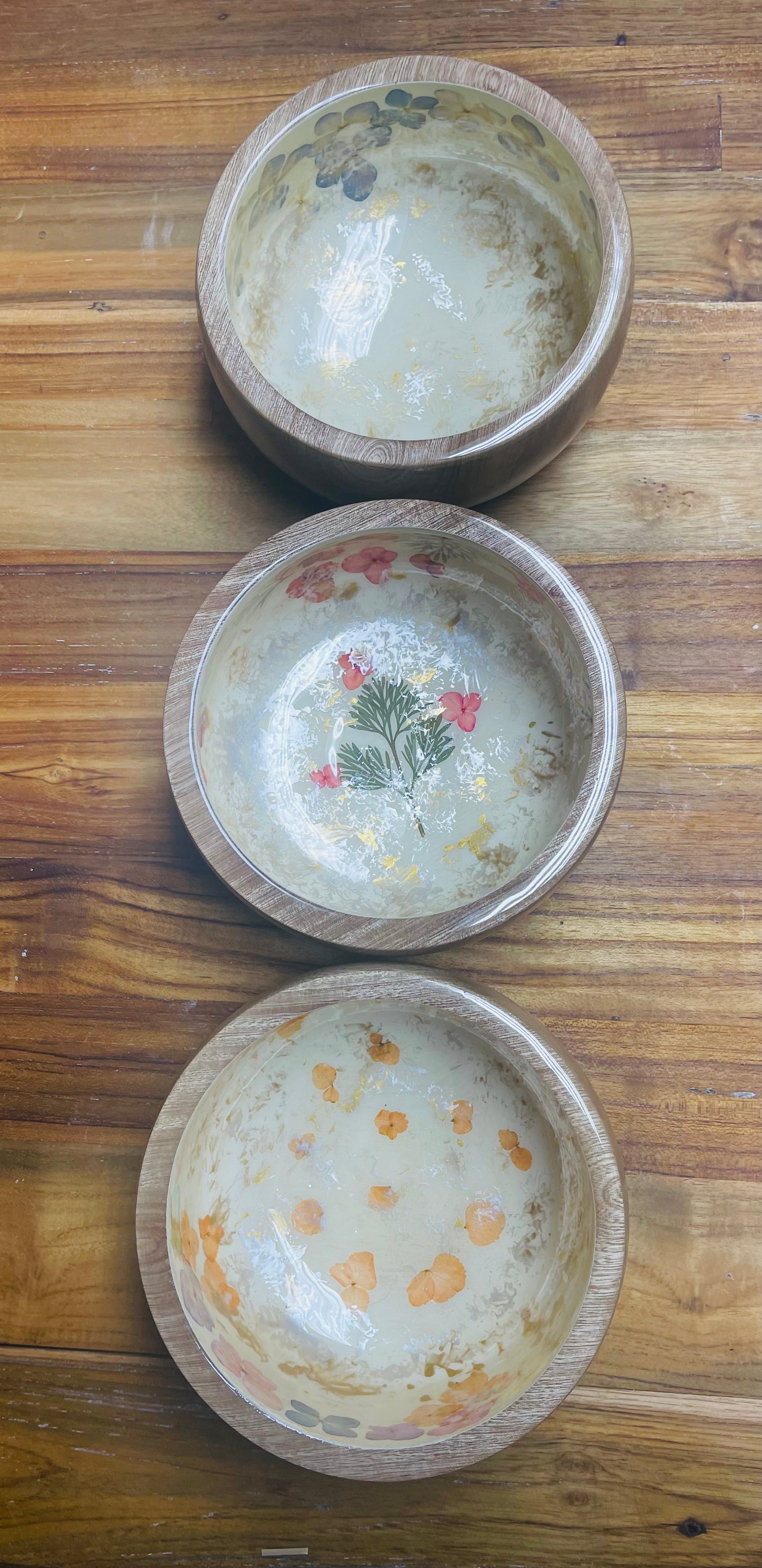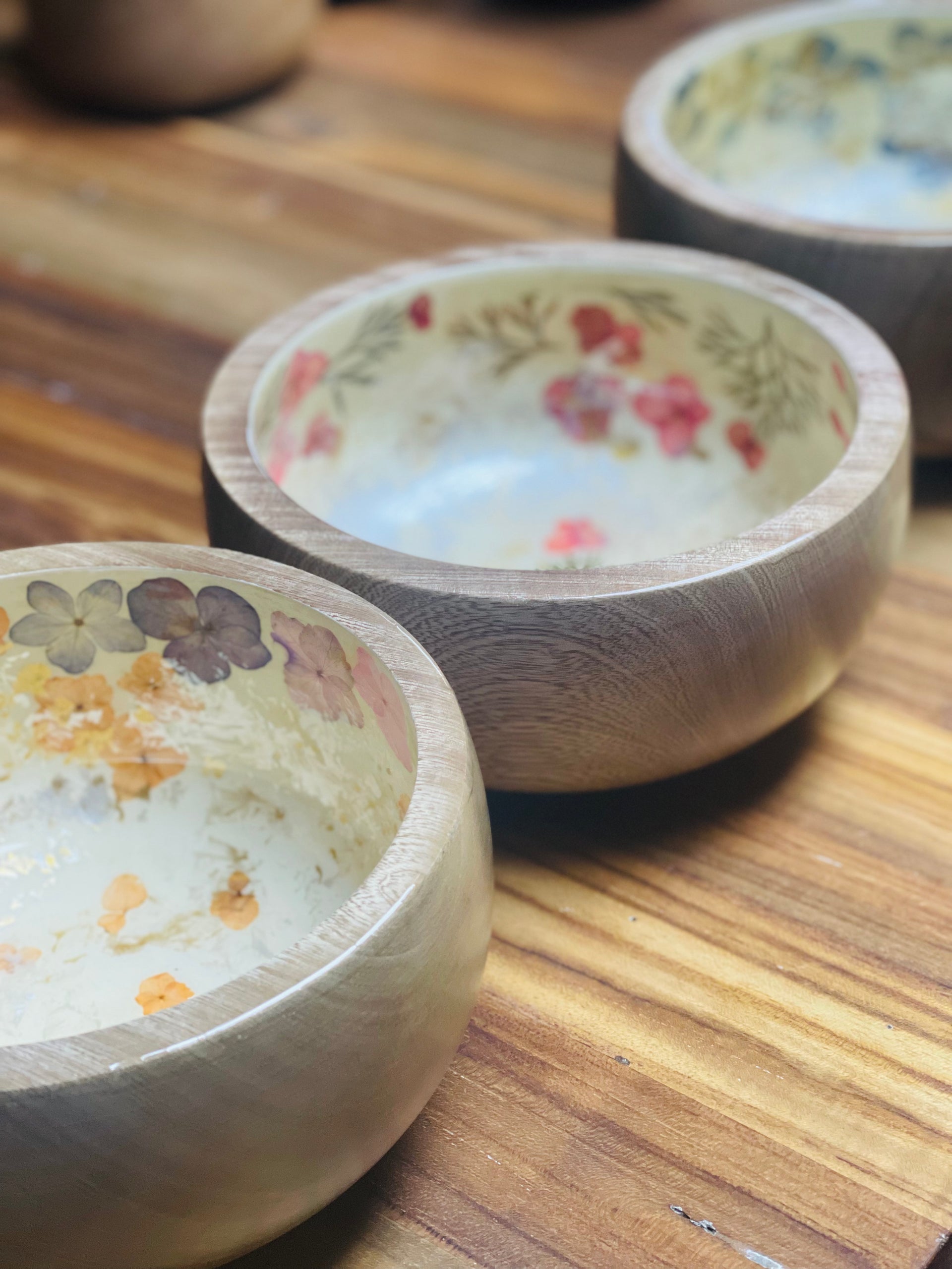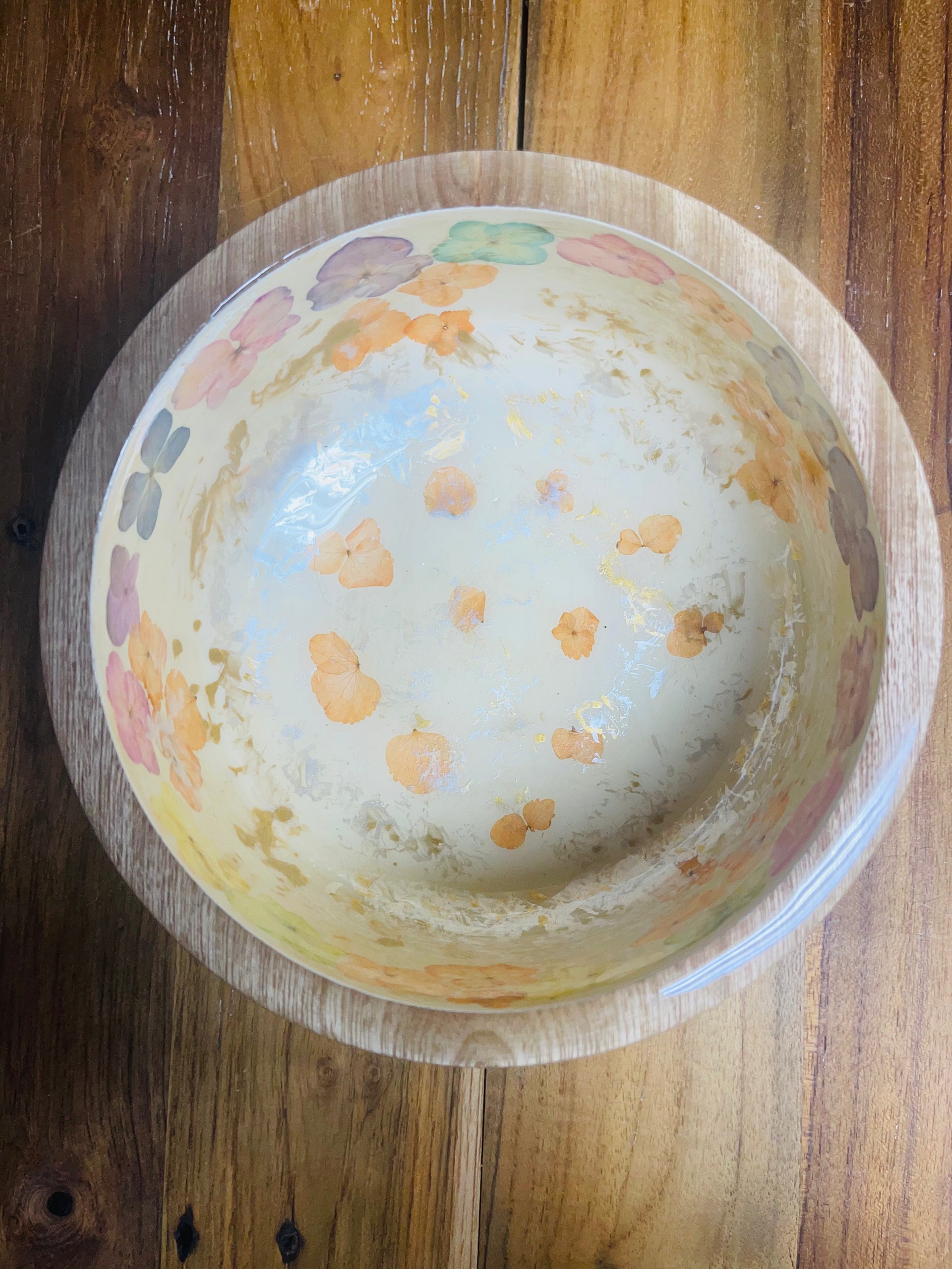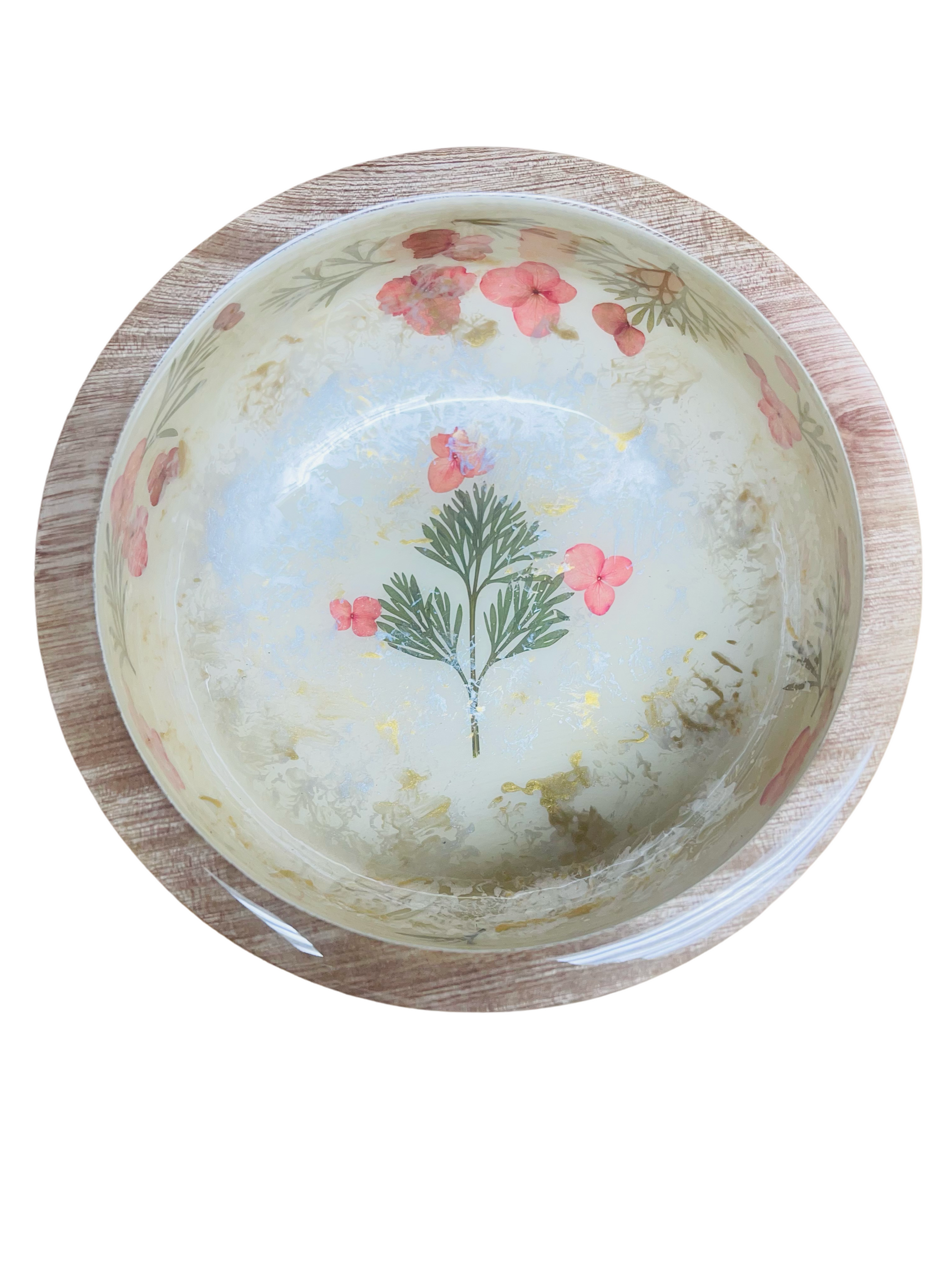 Our Pressed Flowers line is handmade with love by a woman artisan in Bogota, Colombia. She grows the flowers in her home garden, picks them once they bloom, and dries them in old fashioned yellow phone books until they are ready to be artfully placed, one by one, onto each individual bowl/platter. Once she lays out her design, she carefully coats the pieces in several layers of epoxy. The process is a long and arduous one, but the result is truly stunning! Each piece is one of a kind.