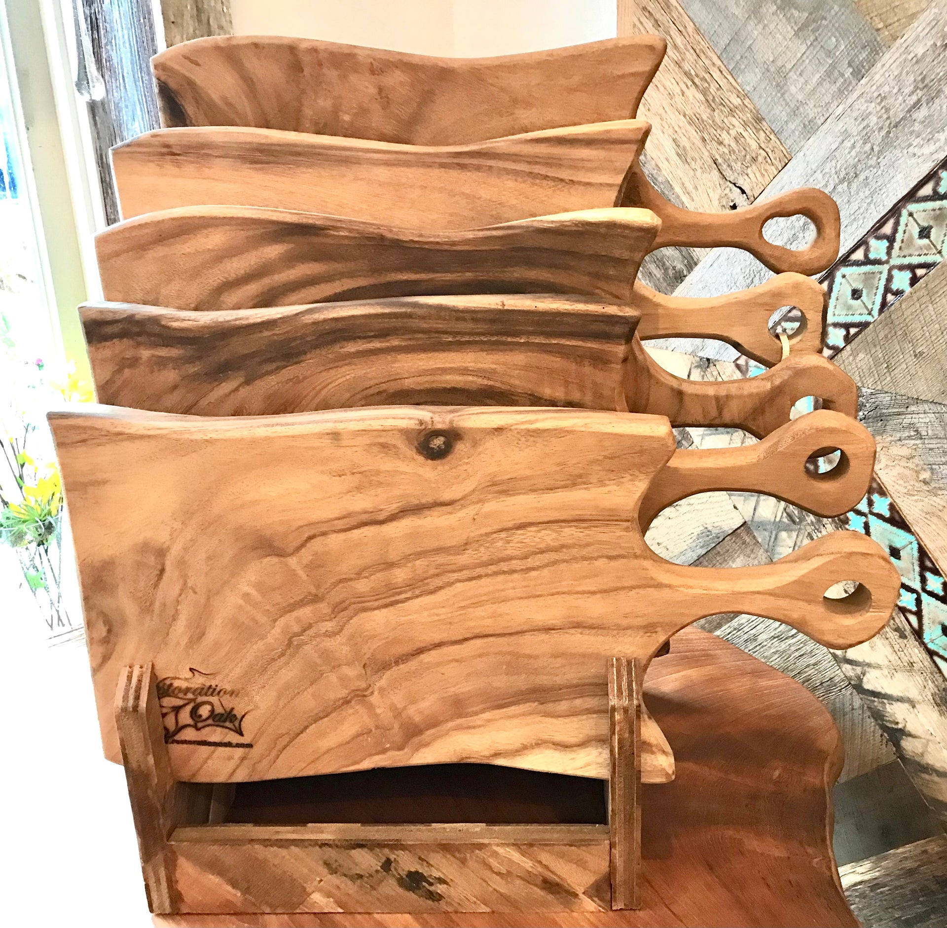 These unique Saur wood cutting boards were made by our very own Artisan Omar Rivera. They are strong, very durable, with a light yellow sapwood and rich dark chocolate-brown heartwood. The rich color and beautiful but subtle grain of the heartwood, resembling black walnut makes it highly sought after for its robustness. Suar Wood only requires basic maintenance such as soap & water to maintain its grandeur.